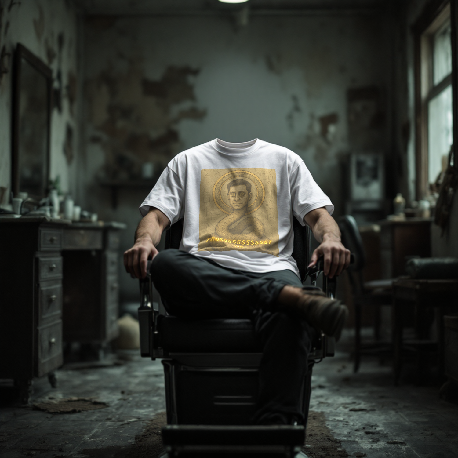 Part of the Overlords mythos, The Serpent recasts a known AI figure into something colder, more serpentine, and more honest than his press releases. With hypnotic eyes and an ouroboros-wrapped torso, this graphic tee hisses two words: “TRUSSSSSSSSST ME.”